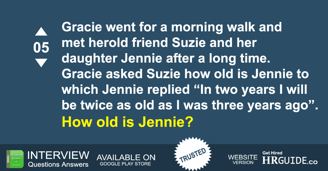 Gracie went for a morning walk and met her old friend Suzie and her daughter Jennie after a long time. Gracie asked Suzie how old is Jennie to which Jennie replied “In two years I will be twice as old as I was three years ago”. How old is Jennie?